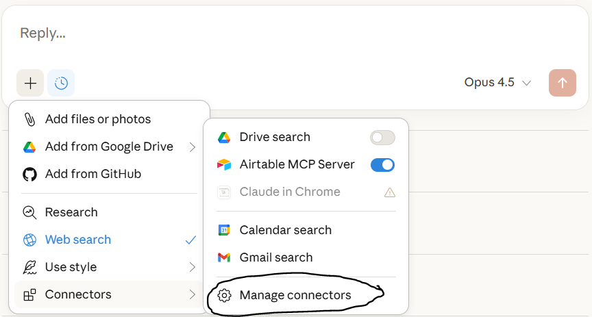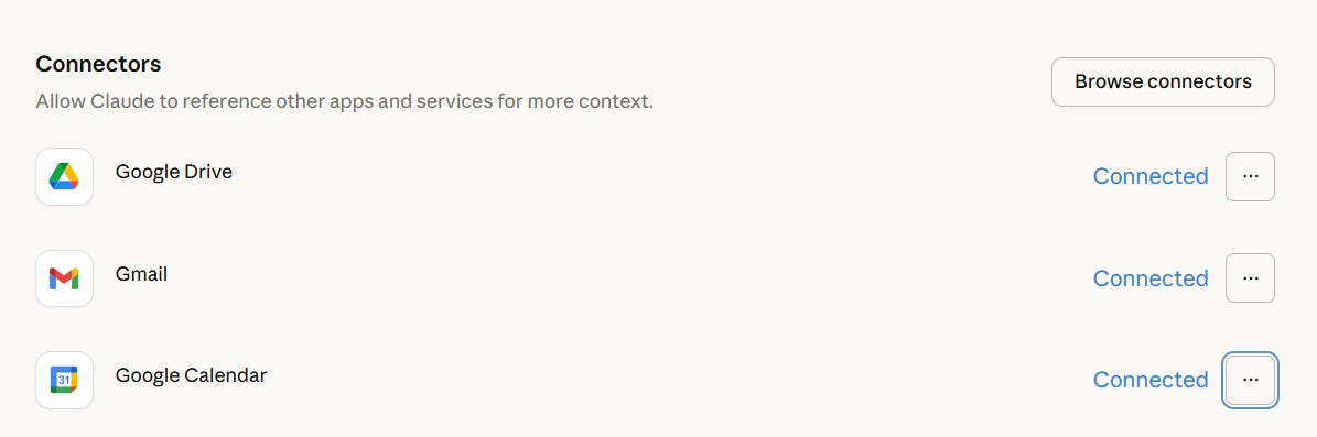 A connector is not required for Skills in general, but for this specific skill we’ll want to use Claude’s built-in Google Calendar connector. In fact, the prompt above will not work unless a Google Calendar is connected. Click the “+” symbol in your chatbox > Connectors > Manage Connectors and then authenticate Google Calendar. As an aside, Google does make you refresh this authentication somewhat often, so even if you’ve authenticated in the past, you may need to reauthenticate occasionally.
