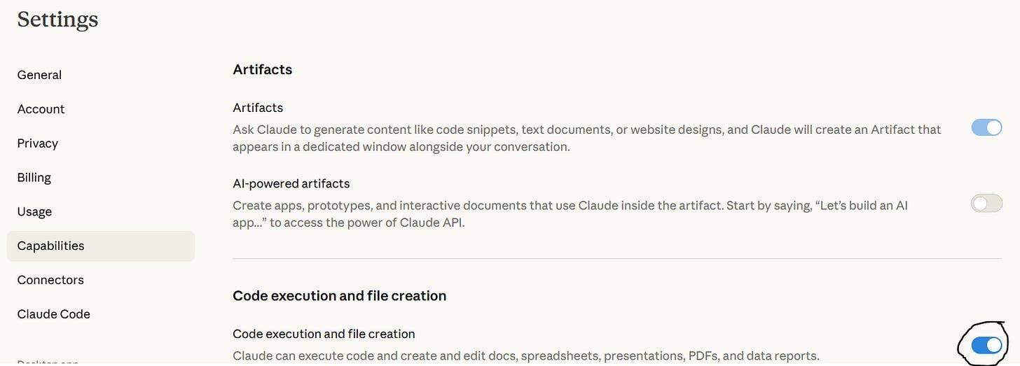 Before you start: Make sure “Code execution and file creation” is enabled in Settings . Go to Settings > Capabilities and toggle it on (see screenshot below). Note, these Settings are accessible either on the web at claude.ai or in the Desktop app.