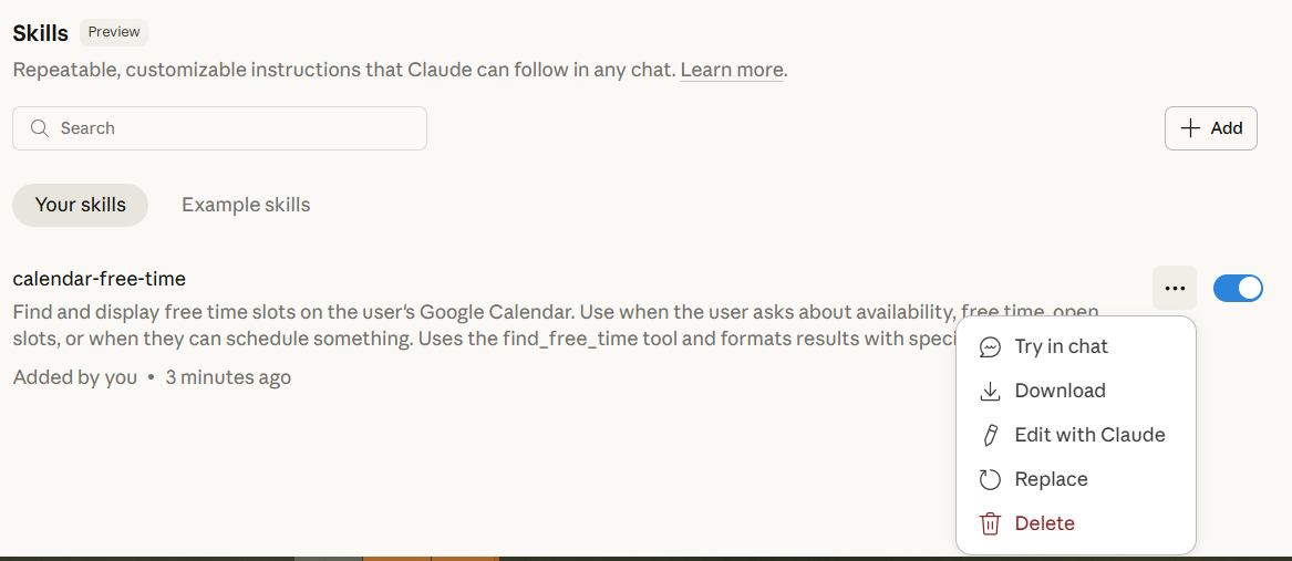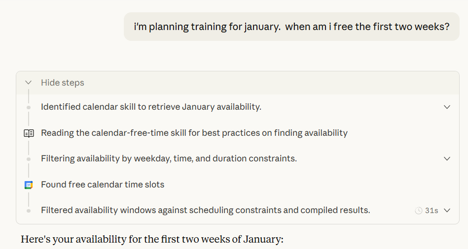The first step is writing a prompt that describes what the Skill should be able to do. When Projects and Connectors first came out, we worked on a prompt to look at our calendar and return free times in a format that could easily be pasted into email. Until now, that had just lived in a Project.