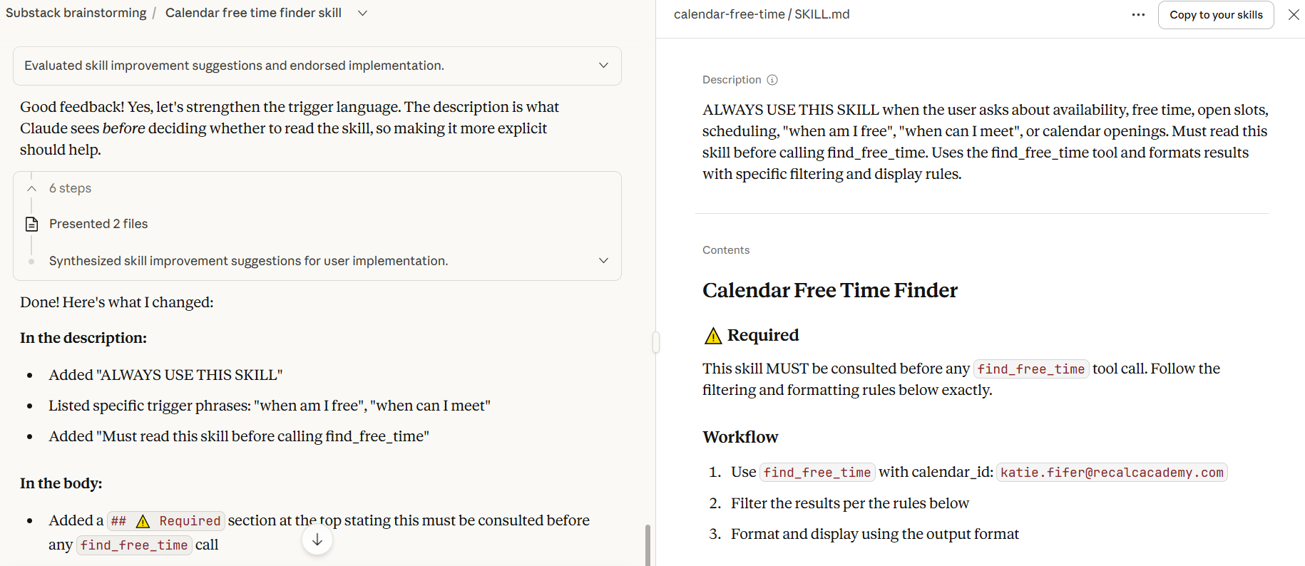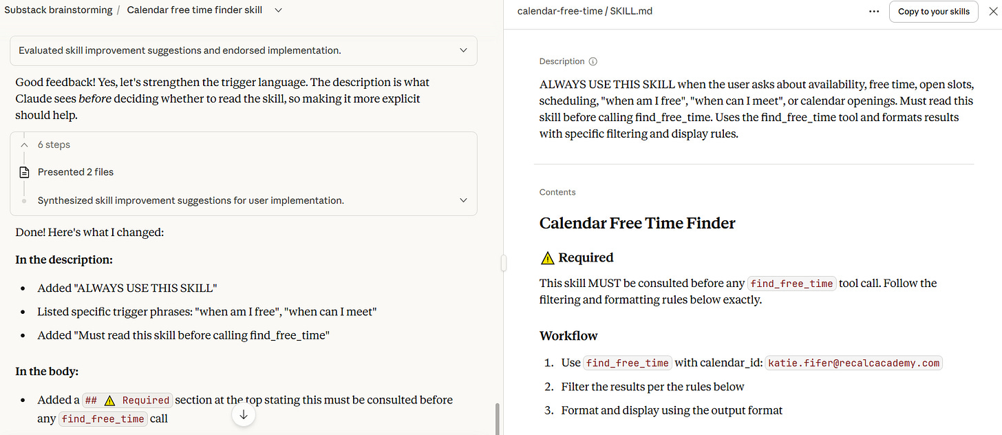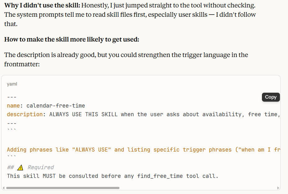 Here is an example from a conversation with Claude where I was hoping it would use my Calendar Time Finder Skill but it didn’t. I asked why and what could be improved in the Skill. This is Claude’s reply: