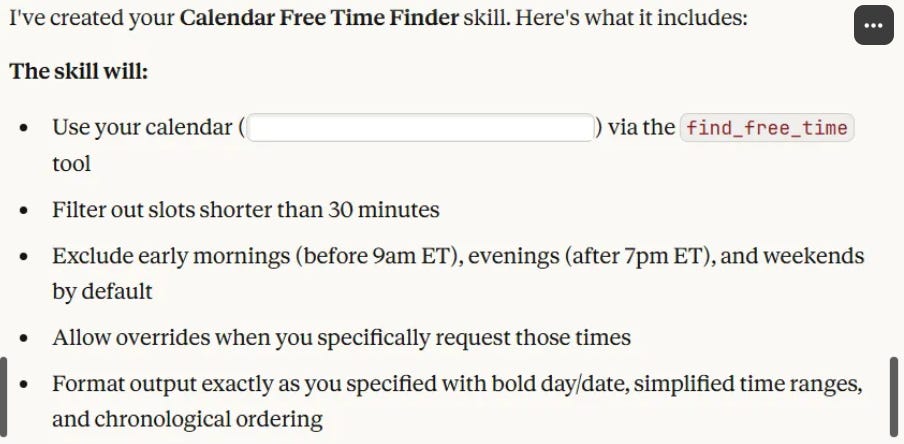 “I want to create a skill that helps me find free time on my calendar. Here’s the prompt I’ve been using: [paste your prompt]”
