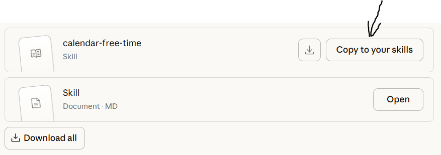 Alternatively you could save it as SKILL.md in a folder called calendar-free-time, update the email in the text of the SKILL.md, zip the folder, rename the zip to calendar-free-time.skill, add to your Claude project (Settings > Capabilities > Skills > +Add). Weirdly SKILLS are just a zip of a skill folder with a .skill extension.