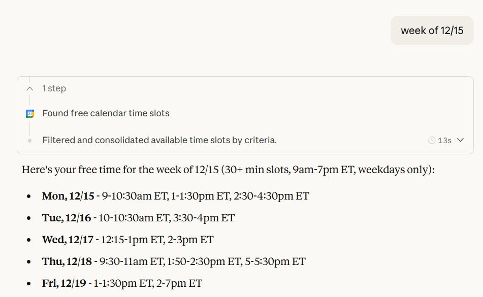 So when I was developing this prompt, I gave Claude an example of an email format I liked, explained the context, and asked it to write a prompt. I tested a bit, gave Claude feedback, and it refined. The prompt tells Claude to check my calendar, filter for 30+ minute slots during work hours on weekdays, and format the output in a specific style I like.