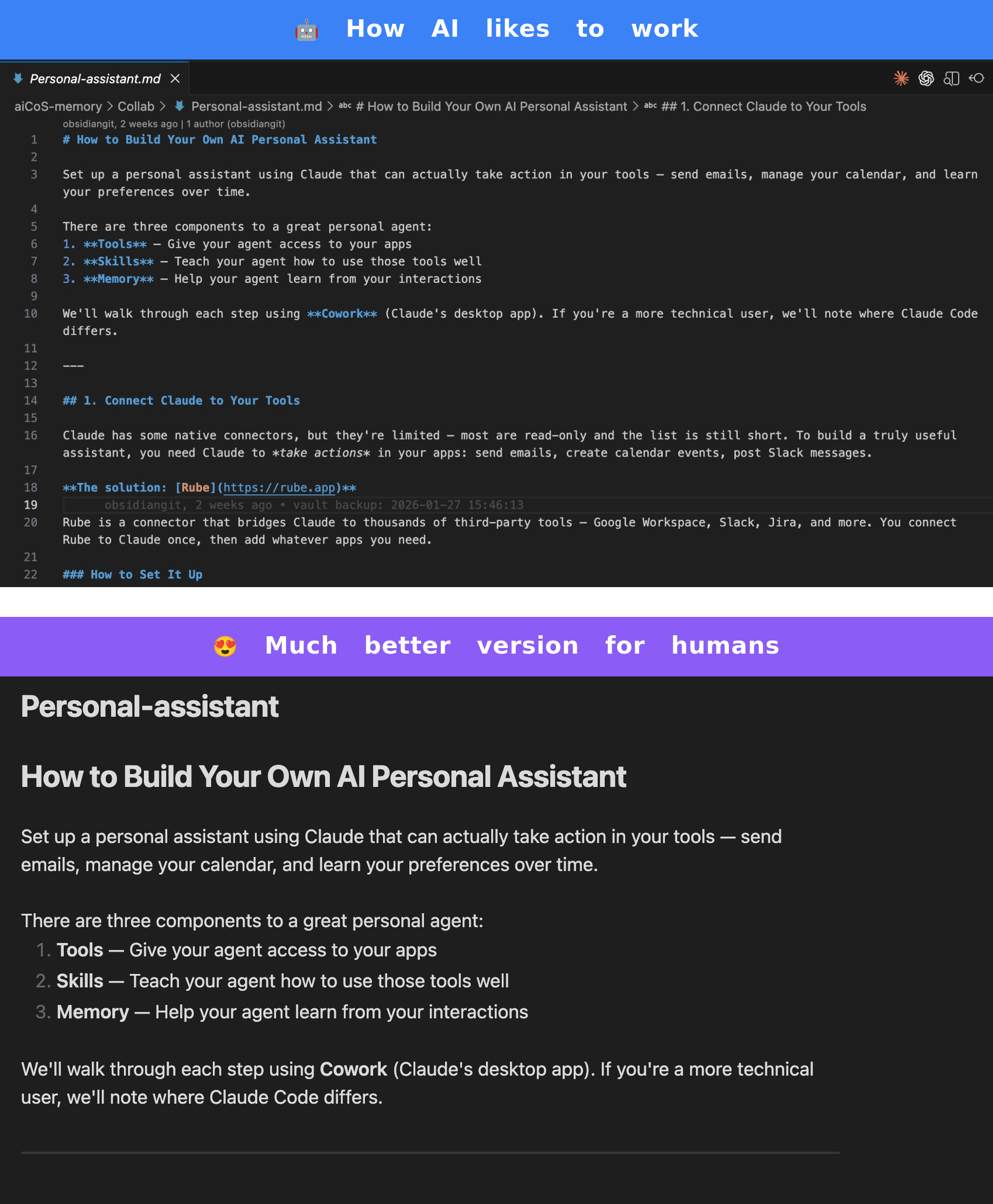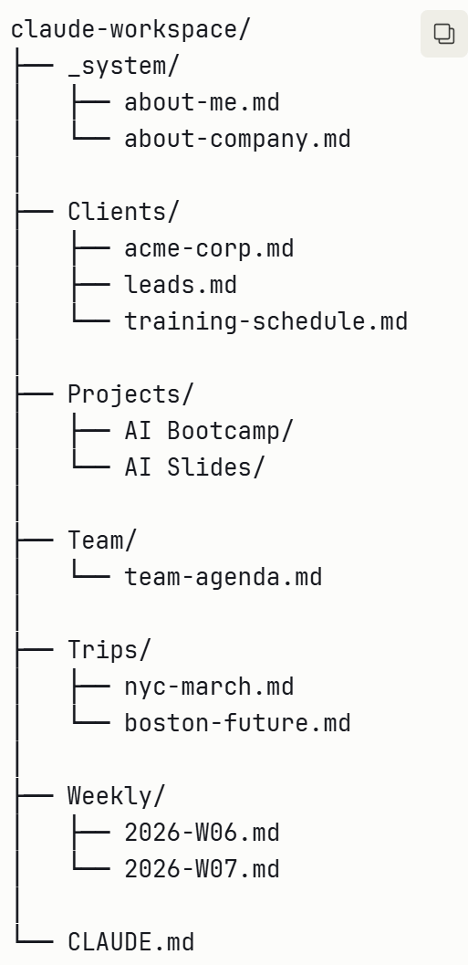 What makes this work: you don't have to organize anything. Claude figures out where information belongs and can update multiple files at once - a client record, your to-do list, a project tracker - in a way that would take a human an unreasonable amount of time.