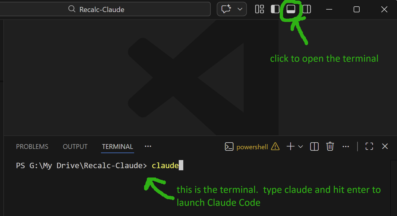 Open the Terminal in VSCode by clicking the toggle icon in the upper right. The Terminal will automatically open in the folder you selected.