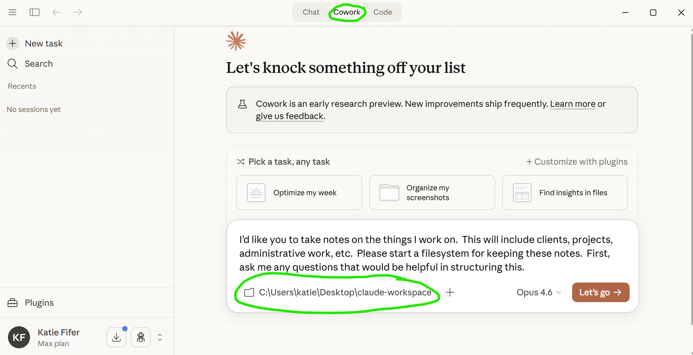 “I’d like you to take notes on the things I work on. This will include clients, projects, administrative work, etc. Please start a filesystem for keeping these notes. First, ask me any questions that would be helpful in structuring this.”